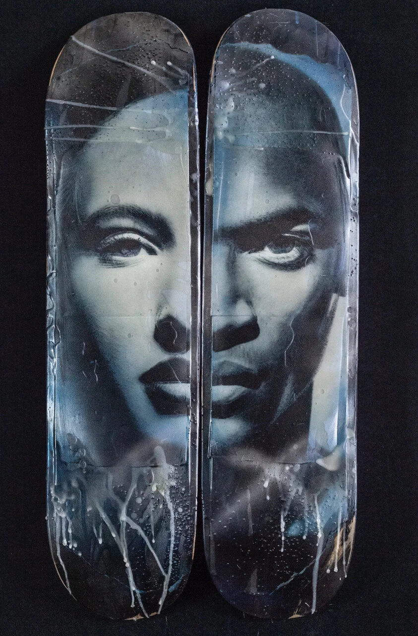 AK Liesenfeld appreciated Bob's collaborative spirit when working with other artists. Bob’s photographs of a man's and a woman's face painted onto the bottom side of two skateboards were of particular interest to her. AK shared that she is “very interested in the growing movement toward gender fluidity in fashion so the piece really spoke to me. The design we came up with is supposed to be an accessory you can throw over any outfit. It features an asymmetrical skirt and a bodice designed to bring attention to the fluidity between the faces on the photographs.”